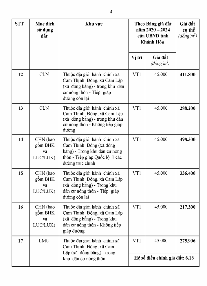 UBND thành phố Cam Ranh vừa ban hành Quyết định số 8028/QĐ-UBND ngày 04/10/2024 về việc phê duyệt giá đất cụ thể để tính bồi thường khi Nhà nước thu hồi đất để thực hiện dự án: Khu đô thị ven vịnh Cam Ranh (Khu 1: Xã Cam Lập, xã Cam Thịnh Đông)